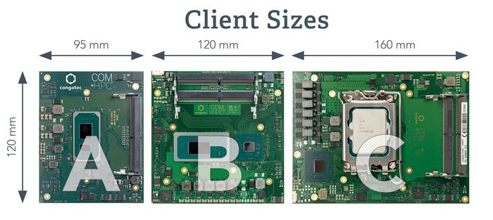 | 3 different sizes | COM-HPC Client modules come in Size A (120x95 mm), Size B (120x120 mm) and Size C (120x160 mm). | Different sizes allow designers to optimally balance the requirements of processor build, performance, memory capacity, and heat dissipation with the space provided by the application. |
