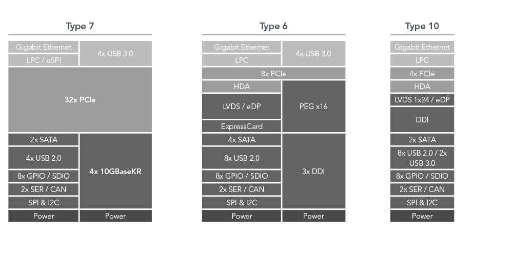 The PICMG specification defines different pinout Types in order to fulfill application specific demands. The pinout Types 1, 3, 4 and 5 are considered as legacy and are not used for new designs any longer. Products featuring older pinout Types are still available and refer to the revision 2.1 of the COM Express specification.
